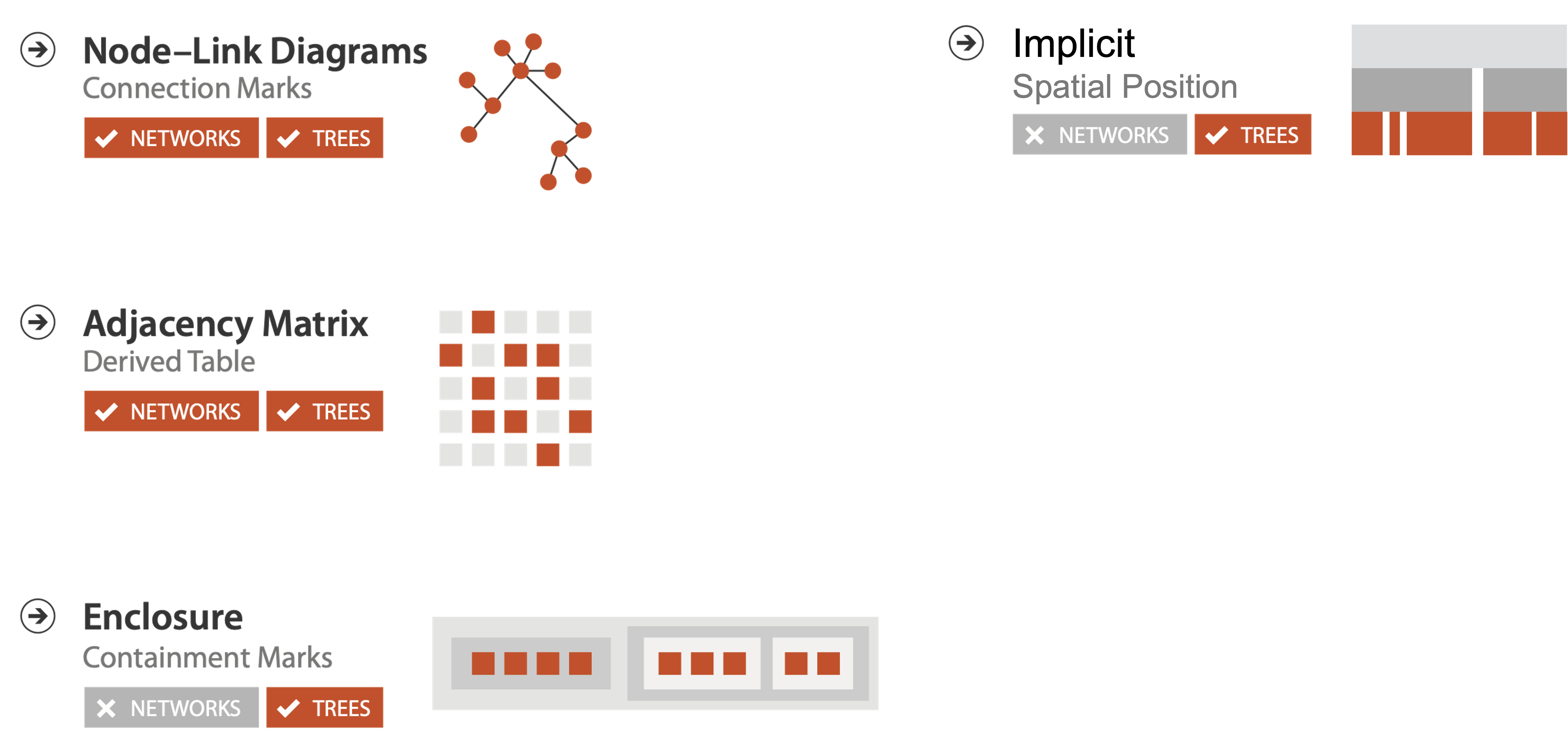 - Spatial position: no meaning directly encoded, left free to minimize crossings