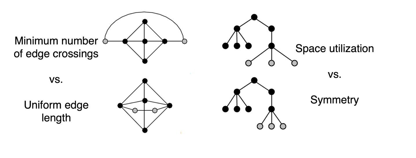 - F(layout) = a(crossing counts) + b(drawing space used)+…