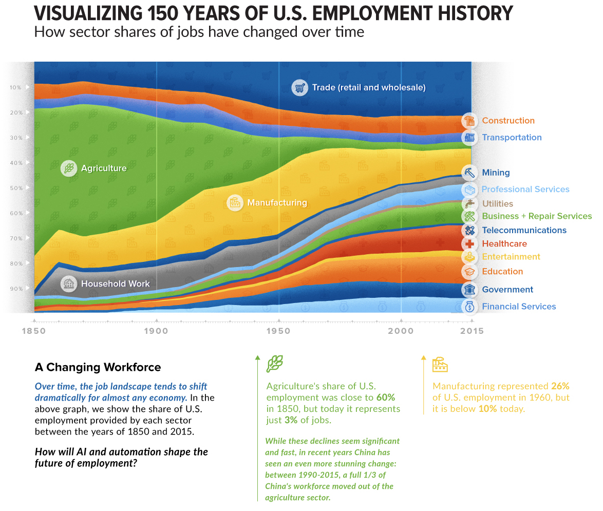 Many of the changes in the distribution of labor across sectors have been driven by changes in the efficiency of human labor, which can be considered as the ratio of production to cost.